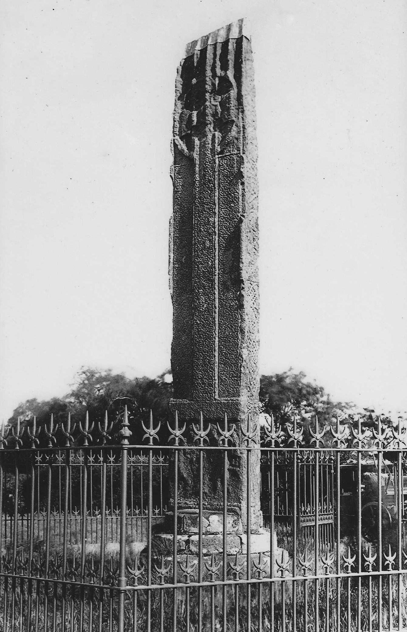 - 1837AD; Stone of Forres, conservation area fenced in by metal railing.
